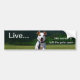 An inspiring bumper sticker featuring a beautiful, vibrant photo of a dog bounding through a field, with an expression of pure joy and freedom, and the phrase: "Live... like someone left the gate open."