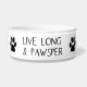 Cute pet accessories with funny pun quote that says "live long & pawsper" in cute hand lettered font. There are black paw prints around the bowl as well. Modern and hilarious design.