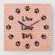 A fun design for dog lovers featuring paw print silhouette clock face, "live, love, bark" text and red chevron striped background
