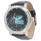 Fun watch for musicians and music lovers features "Live Music" aqua neon text, pink and aqua guitar outline , and a white clock face on black background.