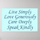 Live Simply, Love Generously, Care Deeply, Speak Kindly. Words to live by every day. Designed to go on a blue background.