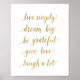 live simply, dream big, be grateful, give love, laugh a lot inspirational art, quotes, gold, calligraphy, office print