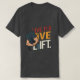 The t-shirt design features the phrase "Live to Lift." in bold, contrasting colours. The text is prominently displayed on the shirt, with a focus on the words. The colours used are vibrant and eye-catching, making the design stand out.