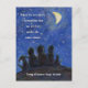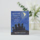 The postcard message notes, "When we are apart, I remember that we all live under the same moon. Long distance hugs to you". The art shows the shadows of three humans, a dog, and a cat gazing up at a crescent moon under a star-filled sky. Art was made using acrylic washes followed by pastel on paper.