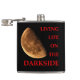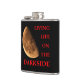 The flask itself is fine. It’s a cheap flask, obviously bought in bulk, however am prepared to overlook that. Given that it is a personalized item, I would have liked to have seen gift boxing instead of the generic packaging. Terrible printing, and/or quality. It’s a cheap, tacky vinyl. It is not cut straight and is also applied in a way that it is overhanging the bottom, causing the glue to catch on items and it will eventually roll and tear, damaging the wrap.