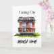 Keep in touch with this beachy card with a beach house with tropical plants watercolor style, with the funny quote, "Living on Beach Time." Ai art. generativecontent