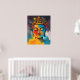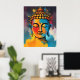 The artwork depicts a close-up portrait of Buddha, painted in a vibrant and colourful style. His face is serene and peaceful, with a gentle smile. The colours used are predominantly warm tones of yellow, orange, and red, with splashes of blue, creating a dynamic and energetic background.