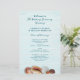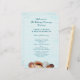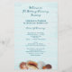 Living seas wedding program printed on affordable paper. Customise text on both sides over a light blue wood image. On the front, the bottom has realistic seashells and a sand dollar. Text is deep sea blue colour and alternates between script and printed fonts. Space is given on the back for a short message from the couple. The paper is 5.5 x 8.5 in size.
