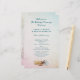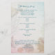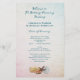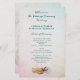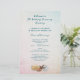 Living seas wedding program printed on affordable paper. Customise text on both sides over a gradient background with seashells on the front and more sea life on the back. Text is deep sea blue colour and alternates between script and printed fonts. Space is given on the back for a short message from the couple. The paper is 5.5 x 8.5 in size.