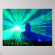 A dj mixing it up on the decks and bathed in laser light from behind.
