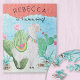 Personalised kids puzzle with adorable llama illustration. The template is set up for you to add the child's name, so the text reads "[name] is llamazing!". The puzzle has a watercolor illustration of an adorable fluffy white llama standing in a cactus garden. She is wearing a pink flower in her hair, tassels and traditional Peruvian saddle mat. Cute and charming design to entertain a llamazing child.