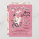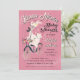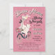 Llama Mama baby shower invitations. Features a pretty llama riding a bike to her new adventure, a new baby llama to be! Pretty decorative flowers on a pink woodgrain background.