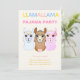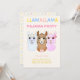 Llama pajama party invitation card. Three cute llamas on light beige background. Multicolored star pattern on the back side. Text is ready to be personalised.