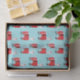 Tissue paper with a illustrated pattern of llamas in Santa suits and hats on a blue background.