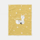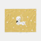 A fleece blanket featuring an illustration of a llama sleeping surrounded by stars. Background is yellow. Personalize the name.