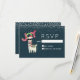 A Christmas RSVP with a whimsical design. A cute llama wearing black sunglasses, a red santa hat, and a festive winter scarf. Also wearing a south american styled blanket and pompoms on his neck. The word Joy written above his head in a festive colourful font. Snow falling down from the top. Set on a dark bluebackground.