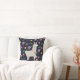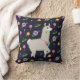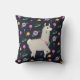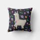 A fluffy llama, draped in a vibrant yarn collar, poses against a deep onyx backdrop adorned with a pattern of lively flowers in shades of orange, pink, blue, and green. This delightful pillow brings a playful and cheerful touch to any room.