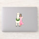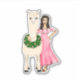 Light beige llama wearing a heart wreath sticker. A fashionable woman in a pink dress is next to the cute llama. Unique hand drawn llama in a valentine's day theme. Cute alpaca with female fashion illustration. Perfect design sticker for friends, sisters, or daughters who love alpacas.