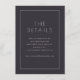 This elegant wedding enclosure card features a sophisticated and minimalist design, perfect for conveying essential details with grace. The clean typography and simple layout create an air of understated elegance, while the dark color palette adds a touch of formality and refinement. Ideal for couples seeking a modern yet timeless look, this card ensures your guests have all the information they need in a stylish format that complements any wedding theme.