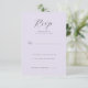 This elegant wedding RSVP card features a soft lavender background with sophisticated black script typography, creating an air of timeless elegance. The minimalist design focuses on clean lines and ample space for personalization, making it perfect for couples aiming to convey a refined and classic aesthetic. With its simple yet graceful style, this card is ideal for those planning a romantic or traditional wedding celebration. Its understated charm ensures that the focus remains on your special day while providing all necessary details in a tasteful manner.