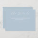 This elegant wedding enclosure card features a soft, pastel blue background with delicate cursive typography that exudes sophistication and charm. The minimalist design focuses on providing essential details in an understated yet refined manner, perfect for couples aiming to convey their special day's information with grace. Ideal for modern weddings, the serene color palette and clean layout create a calming and inviting tone, ensuring guests feel warmly welcomed into your celebration. Customize this design effortlessly to fit your unique event while maintaining its timeless elegance.