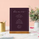 This elegant bar menu design exudes a sophisticated and timeless charm, perfect for wedding receptions or formal events. The deep burgundy background paired with the delicate white script typography creates an air of refinement and class. Featuring categories like beer, wine, and spirits, it offers a clear and organized selection for guests to enjoy. The simple yet stylish layout ensures that your event's beverage options are presented in an inviting and memorable way, enhancing the overall ambiance of your special occasion.