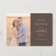 This elegant wedding save the date design features a warm, romantic photo set against a soft, earthy backdrop. The layout combines a tender moment captured in the photograph with sophisticated typography on a rich brown panel, creating an inviting and timeless feel. Perfect for couples looking to announce their special day with grace and charm, this design exudes warmth and love, setting the tone for a memorable celebration. Customisable text areas allow you to personalise your message while maintaining the overall aesthetic appeal.