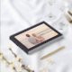 This wedding guest book features a romantic photo design with a soft, dreamy finish that captures the essence of a serene beach sunset. The layout is elegantly framed in black with gold typography, adding a touch of sophistication and warmth to the overall aesthetic. Perfect for couples who cherish intimate moments by the sea, this design evokes feelings of love and tranquility, making it an ideal keepsake for guests to sign on your special day.