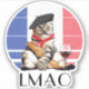 If you try to pronounce LMAO, you sound like a French cat! Le meow! Funny twist to the slang abbreviation of Laughing My A@$ Off. Features a graphic of a French tabby cat with a moustache and wearing a beret & red kerchief. He's seated against a background of the French flag colours, has a glass of red wine and is holding a loaf of French bread.