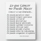 This cancer cannot do poem appears in many of the DonnaBellas Angels art. From online searches, the most that was found about the original authorship was that is supposedly first appeared in the 1960's in an Ann Landers column. Lo que cáncer no puede hacer Cáncer es tan limitado… No puede paralizar amor No puede romper esperanza No puede corroer fe No puede destruir paz No puede matar amistades No puede suprimir memorias No puede silenciar valour No puede invadir el alma No puede robar la vida eterna No puede conquistar el espíritu -Autor desconocido