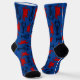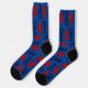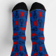 Dark blue patterned socks for men or women with lobster and crabs design. Dark blue lobsters and red crabs crawl over a royal blue background colour. Toes and heels are black. Makes a fun gift for any shellfish lover, seafood cook, or seafaring man.