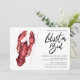 Watercolor lobster boil invitation. Modern brush script graphic "Lobster Boil" with watercolor red lobster and coordinating red and white gingham pattern backing.