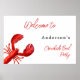 A white background. Decorated with a large red lobster. Personalise and add your text. Black and red text.