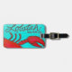 The lobster luggage tag is a vibrant, and features a hand-painted lobster against a vivid turquoise background, crafted from durable lucite. The tag is thick, hefty and durable.