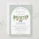 A locally grown themed baby shower invitation that features a watercolor clothes line graphic that features baby clothes and a variety of vegetables and greenery. It has a sage green gingham background and is accented with a modern font. This stylish invitation is easy to edit and is perfect for a gender neutral farmer's market themed baby shower. Pair with anything from the MILLIE collection for a cohesive look.