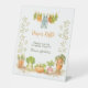Sweet watercolor diaper raffle pedestal sign featuring a charming garden clothesline with baby overalls, fresh carrots, tomatoes, and cute veggie characters around the message “Thank you for bringing diapers!” – the perfect welcoming touch for your Locally Grown Little Sprout Garden Baby Shower. Guests simply place their raffle ticket here for a fun farm-fresh prize draw!