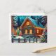 Personalised Christmas postcard. A beautiful illuminated log cabin on Christmas Eve with Christmas lights and snow topped trees. As the snow falls on this magical night, I wish you everything merry and bright. A sweet personalised holiday postcard to give you a warm and cosy vibe.