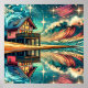 Beautiful colourful waves and a log cabin overlooking the ocean on a starry night.