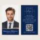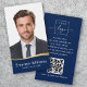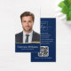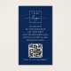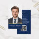 Modern, vertical, dark blue and golden (printed colour gradient, not real foil) curved border business cards with your name and title on the front and customisable template fields for your contact information, logo and QR code on the back. You can change background and font colours, move and resize elements with the design tool.