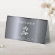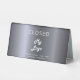A classic dark faux silver looking background, black coloured text. With the text: Welcome on the front and Closed on the back. Personalise and add your business logo and text.