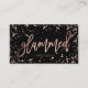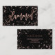 A modern, stylish glammed logo lashes, eyes makeup artist business card with modern hand lettering style brush typography in faux rose gold foil on a rose gold confetti splatters with customisable black background.