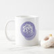 White mug with circular logo.