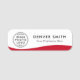 White name tag with a red wave border along the bottom and your custom name and title. Upload your own logo and create name tags for your business or event. You can change fonts and colours with the design tool.