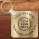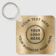 Simple promotional keychain for your business or organisation on a brushed gold faux metallic background. Add your logo or QR code and two lines of customised text, such as your company name, slogan, thank you, or leave blank.