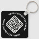 Double sided keychain with your custom logo on a white, round background surrounded by circular text on the front and QR code on the back on a black or custom colour background. Change fonts and colours, move and resize elements with the design tool.