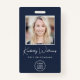 Professional blue ID badge featuring your employee's photo, their name in a chic white script and their title in simple white lettering, and your business or organisation's logo. On the back, add additional information and optional QR code.