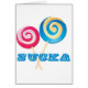 Two lollipops in blue and pink crossing each other. Text reads: Sucka.