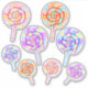 Sticker with multicolor lollipops caramel digital illustration. Round swirl candy pink, yellow and blue colours.