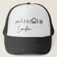 This trucker hat features a silhouette style line art illustration of the skyline of London.