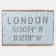 Latitude and longitude coordinates for London, England in grey, urban stencil-style font